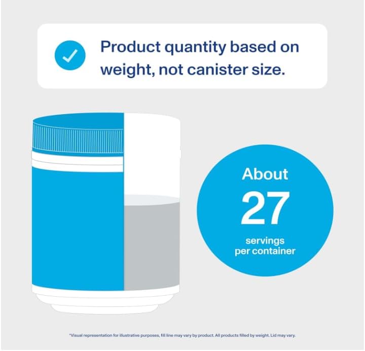 - 0.71 ounces of collagen powder per serving. We provide a measuring scoop; two scoops of powder = 0.71 ounces. This is also why the container isn't full, as you have to leave room for the scoop. And our product quantity is based on weight, not container size.